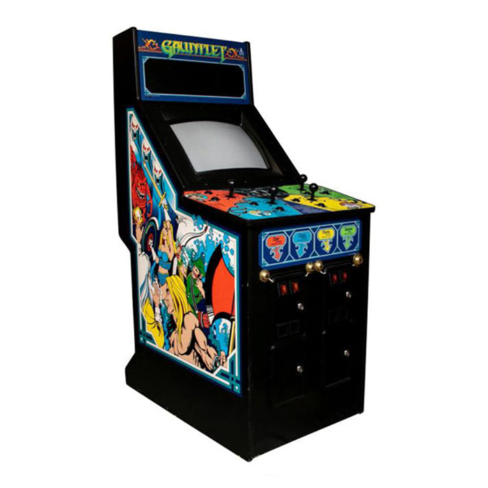 Navigate with through mazes teeming with ghosts, demons, and treasure in this classic dungeon crawl arcade game. Released in 1985 by Atari, Gauntlet was one of the first four-player arcade games of it’s kind. The players choose which of the four characters they wish to play: The Warrior, The Wizard, The Valkyrie, or The Elf. Each character has different strengths and weaknesses and players can cooperate to successfully clear each level. Enemies drain a player’s health, but it also drains slowly on its own giving each level a time limit. Each player has a joystick and two buttons, one to fire or fight enemies, and the other to use magic. Food can be picked up to restore health, and potions can be picked up that will destroy all the enemies on the screen.